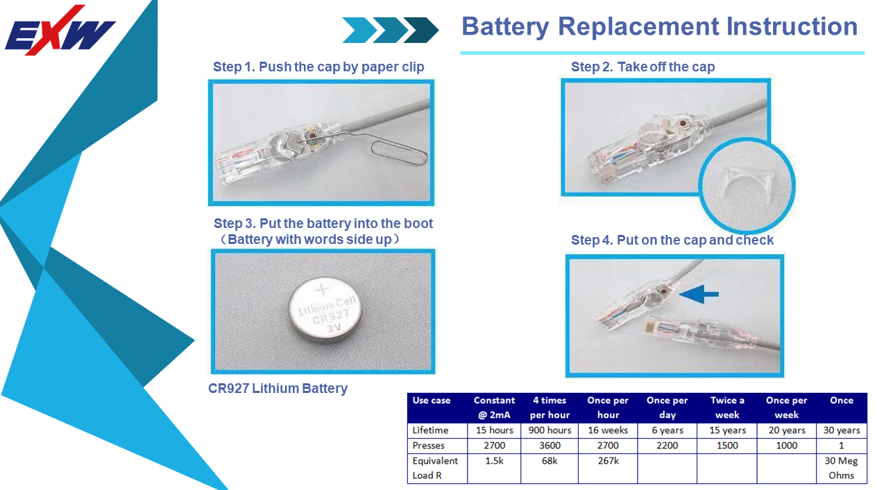 Þetta er ný gerð af snúru. Ýtirofar eru á báðum endum snúrunnar; þegar þú ýtir á þá, blikkar LED ljós á báðum endum, sem hjálpar þér að finna hinn endann í tengibrettinu. Ýttu aftur til að stöðva blikkið.