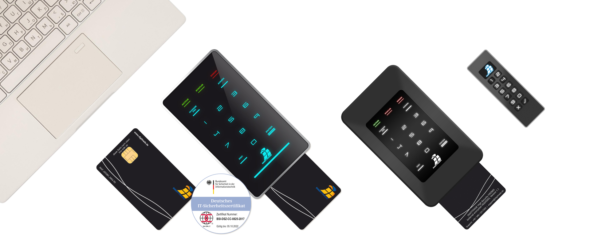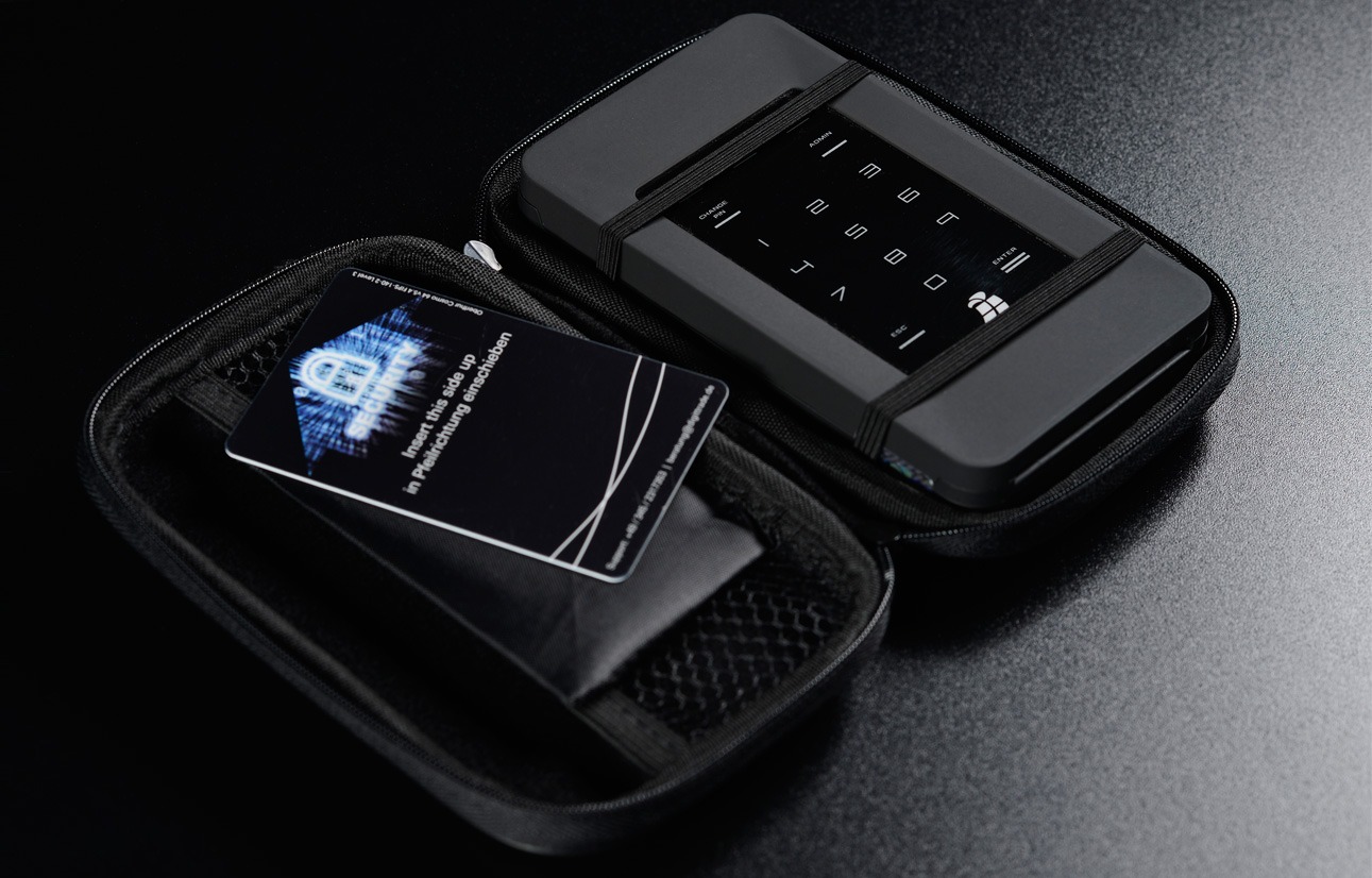 External encrypted hard disk with German BSI (Federal Office for Information Security) certification [expired]. Even though the certification has expired it’s still just a safe and secure as while the certificate was valid, at significant cost savings.