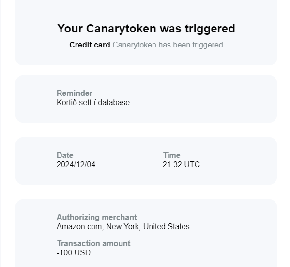 Hér má sjá hvernig einhver óprúttinn aðili hafði komist inn í gagnagrunn þar sem þessi „kanarífugl“, þetta gervikreditkort, var geymdur. Þá er hægt að gera viðeigandi ráðstafanir og rannsaka betur. Þetta eru í raun og veru „gildrur“ sem settar eru upp hér og þar til að láta vita af grunsamlegum „mannaferðum“ svo hægt sé að bregðast við áður en stór árás er gerð.