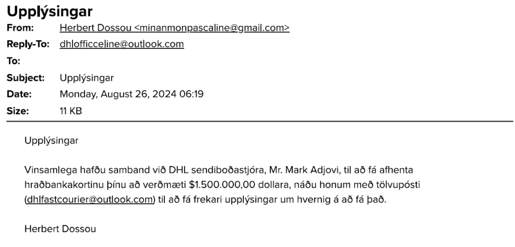 - Þú færð tölvupóst sem lítur út fyrir að vera frá sendingarþjónustu, póstþjónustu, DHL, FedEx, UPS o.s.frv., sem segir að það sé vandamál með sendinguna þína.