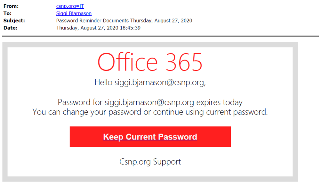 Hér fyrir neðan er annar góður. Fyrir utan hversu slæm tilraun þetta er, þá er tilkynning um lykilorðabreytingu sem býður þér að halda núverandi lykilorði þínu andstæða, svo ekki sé meira sagt. Hér skiptir ekki máli hvort það er raunverulegt eða ekki; þú ættir aldrei að snerta þetta enda er þarna verið að reyna að blekkja þig til að smella á rauða hnappinn.